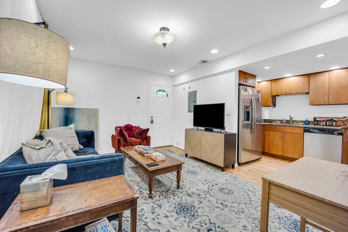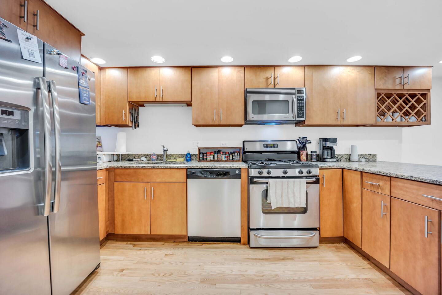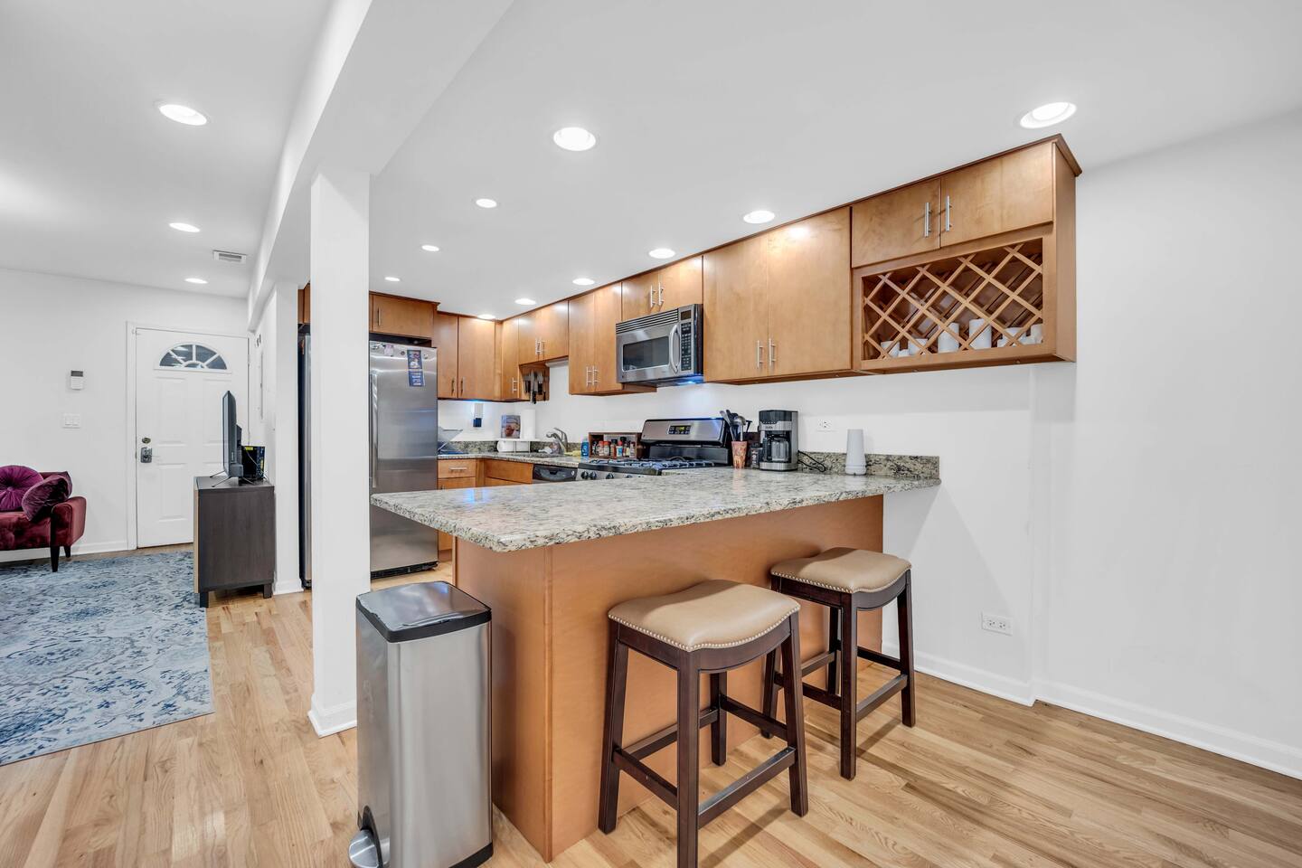 As you step inside, you'll notice the stainless steel appliances in the fully equipped kitchen. The open living space is bright and welcoming, with plenty of seating for everyone and a large flat-screen TV for your entertainment. There's also high-speed Wi-Fi throughout the unit. The bedrooms are both furnished with comfortable queen-size beds and soft linens, and both bathrooms are clean and modern. For your convenience, enjoy an in-unit washer and dryer. One of the best features of our condo is the fully fenced-in backyard, which is perfect for your furry friend to run around and play. There's also a private covered outdoor patio, where you can enjoy a cup of coffee or a glass of wine. A starter supply (trash bags, coffee pods, toilet paper, dish soap) is provided on check-in day. These items won’t be restocked—guests are responsible for any extras needed during the entire stay.
