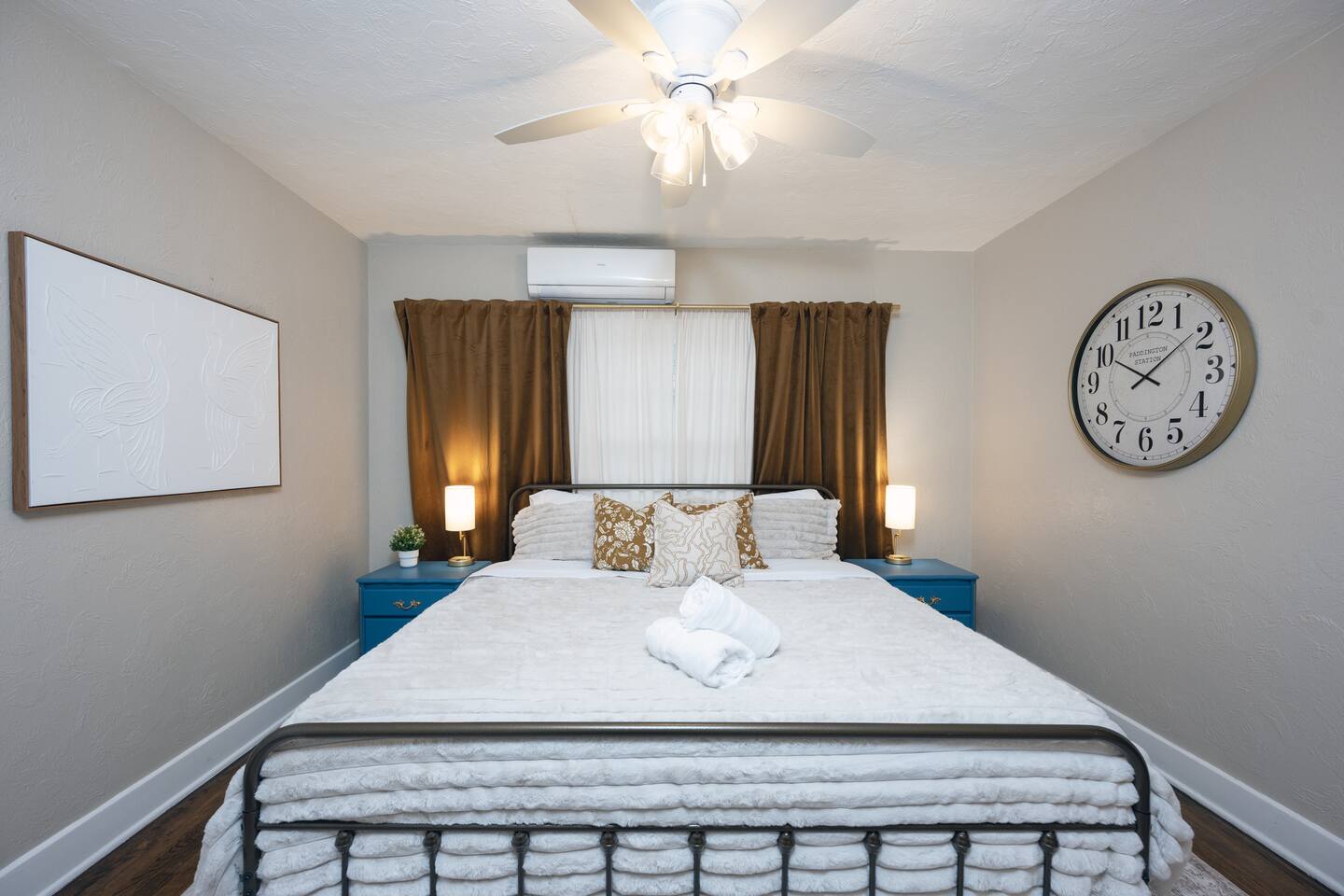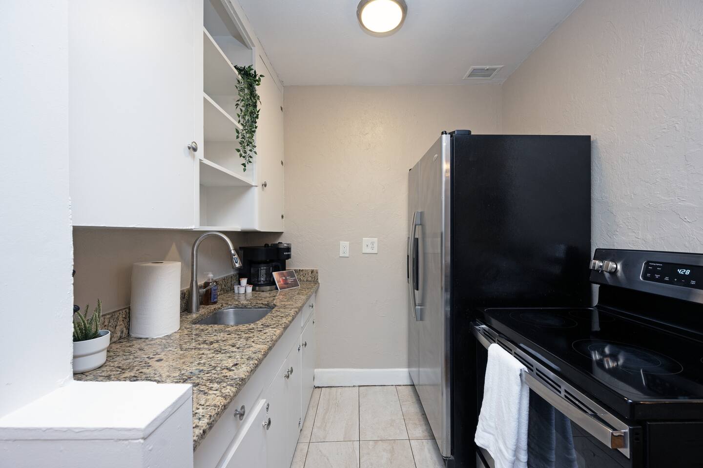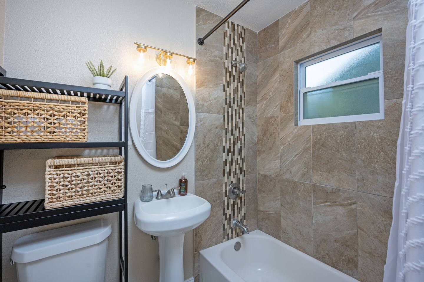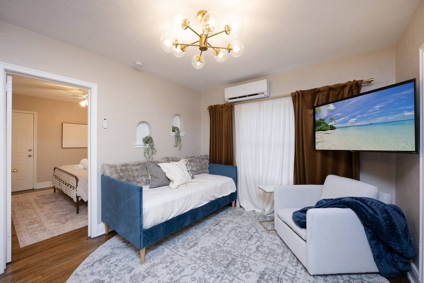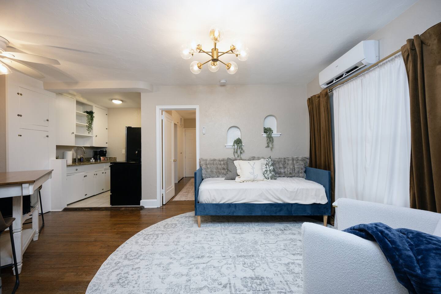 Living Space: Unwind in our spacious living room, featuring a plush couch perfect for lounging while watching your favorite shows on the 50-inch flat-screen TV. The room-by-room climate-controlled environment keeps you comfortable in any weather. Kitchen and Dining: Our expansive kitchen and dining area is fully equipped with stainless steel appliances, including a Keurig coffee maker, a countertop dishwasher, a microwave, and a full-size fridge and freezer. With ample space for baking and cooking, every meal becomes a special event. Bedroom Bliss: Enjoy the ultimate sleep experience on our luxurious king-size bed. The bedroom, bright and welcoming, ensures a peaceful night's sleep. Bathroom and Laundry: The bathroom features a convenient shower/tub combo perfect for soothing soaks or quick pet baths. Coin-operated laundry facilities on-site add to the practicality of your stay. Outdoor and Extras: Relax or entertain in our large shared backyard, perfect for grilling or enjoying the outdoors. The unit includes two off-street parking spaces, with additional free street parking available. Parking - Street parking is available but is based on a first-come-first served basis. No parking space is guaranteed. A starter supply (trash bags, coffee pods, toilet paper, dish soap) is provided on check-in day. These items won’t be restocked—guests are responsible for any extras needed during the entire stay.