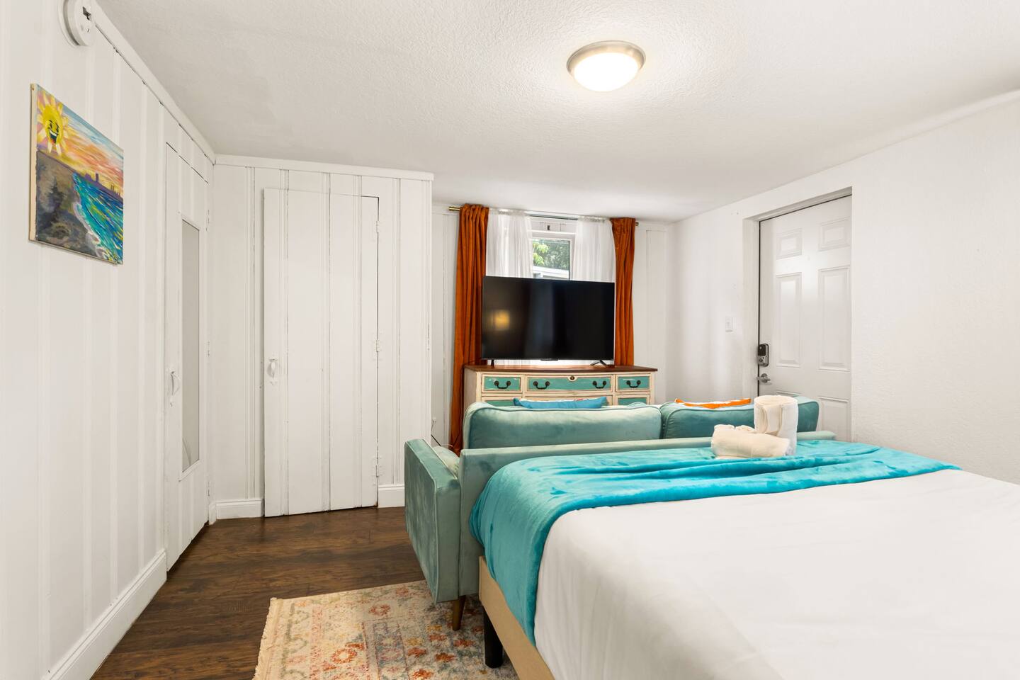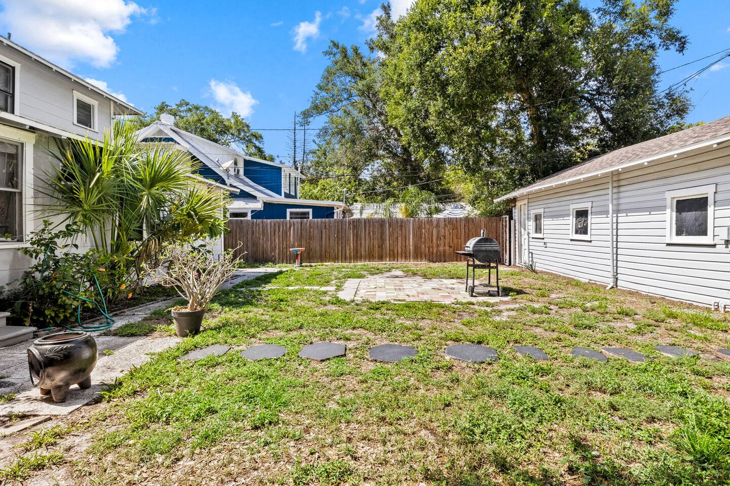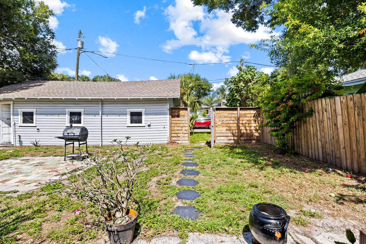 Nestled in the vibrant heart of downtown St. Pete, the Sunset Citrus Studio is an inviting first-floor studio apartment as colorful and warm as the city of St Pete. Inside, you'll find the world's most comfortable queen-size bed, when not out exploring St pete, you'll enjoy lounging with a book or catching up on your favorite series, with the 52-inch TV on the signature velvet couch. Our favorite part of the property is the historic brick roads and fenced in shared backyard for pet lovers!