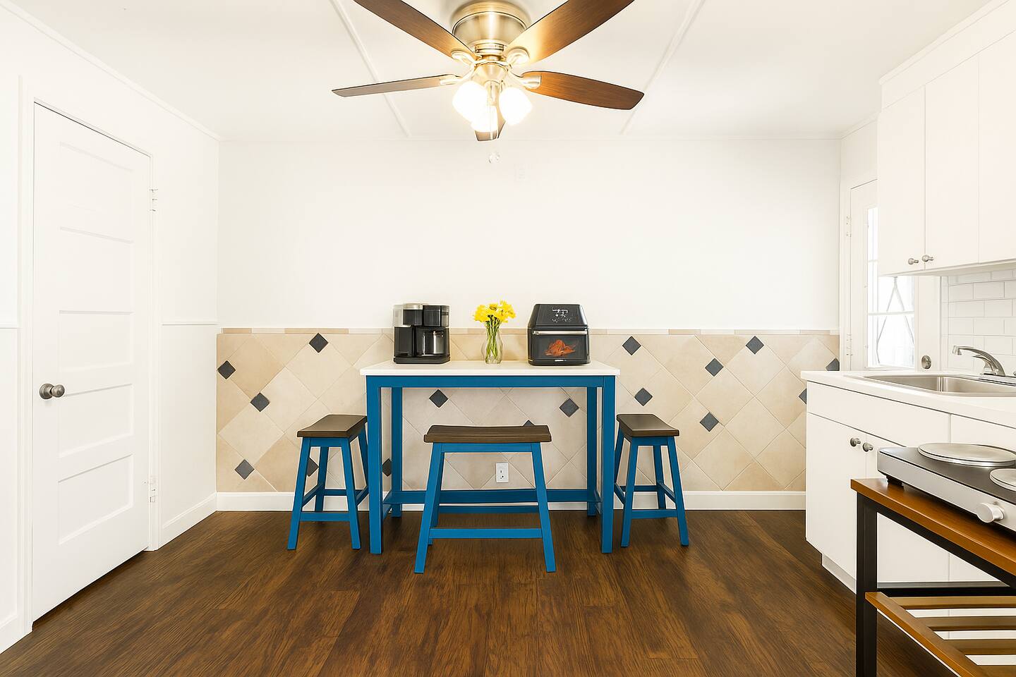 A starter supply (trash bags, coffee pods, toilet paper, dish soap) is provided on check-in day. These items won’t be restocked—guests are responsible for any extras needed during the entire stay.